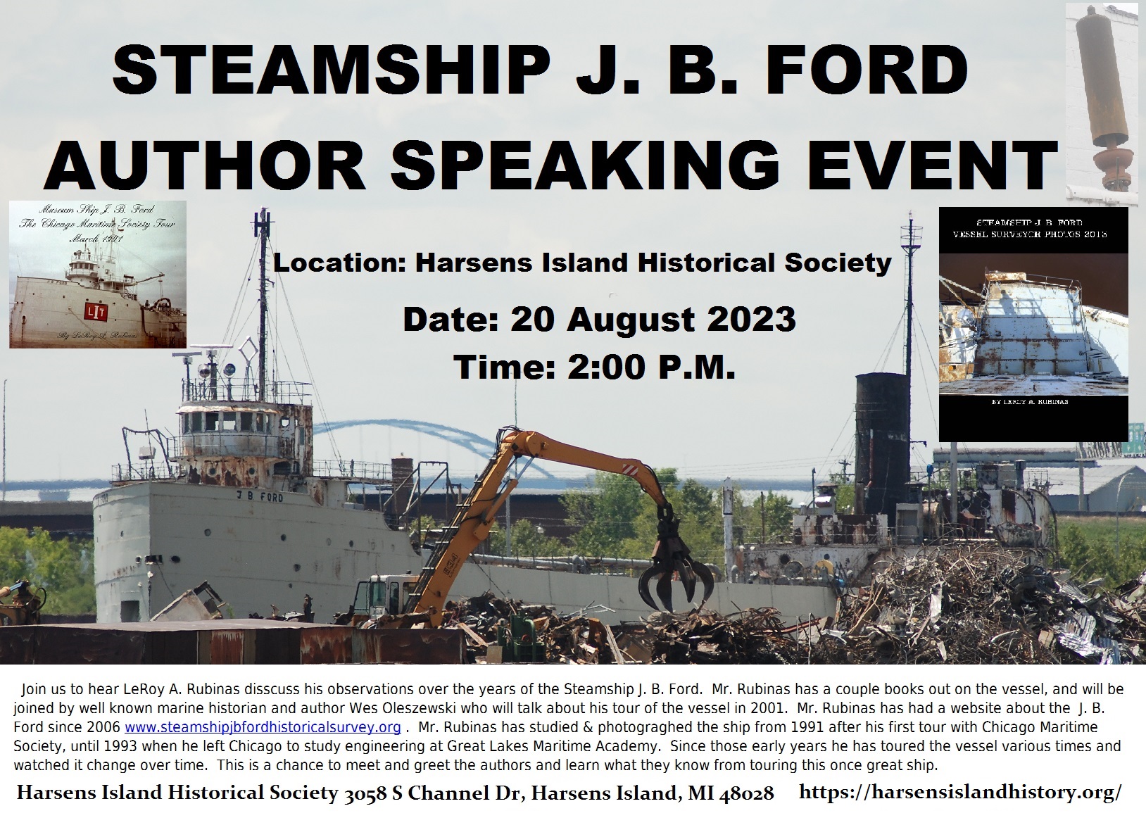 On August 20th, 2023 after 2 pm, a Steamship J. B. Ford history talk was held at the Harsen’s Island Historical Society. This museum has in their collection the main steam whistle from the J. B. Ford. Writers LeRoy A. Rubinas and Wes Oleszewski spoke about their history with this ship. The ship’s bell was on display for this event. The former counsel for Inland Lakes Management and donor of the whistle in 2017 John Cameron, Jr., added his insight. He explained the propeller for the J. B. Ford in 2003, was removed , so the ship could fall under USCG rules for a barge instead of a steamship.